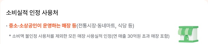 - 인정 항목: 전통시장, 동네 음식점, 미용실, 중소·소상공인 매장 등 오프라인 매장에서 카드로 결제한 경우