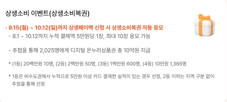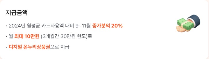 - 2024년 월평균 카드 소비와 비교해 2025년 9~11월의 소비 증가분의 20% 환급한도: 월 최대 10만 원, 총 최대 30만 원