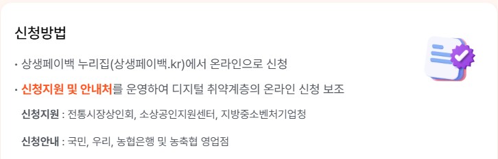 - ② 오프라인 지원 → 전통시장 상인회, 소상공인지원센터, 주요 은행 등에서 신청 보조