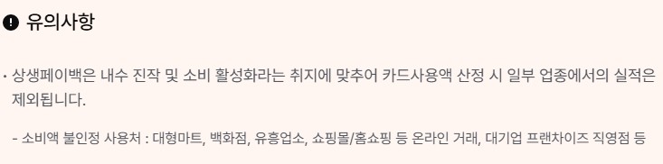 - 제외 항목: 대형마트, 백화점, 온라인 쇼핑몰, 배달앱(오프라인 카드 단말기 사용하지 않은 경우), 유흥업소 등