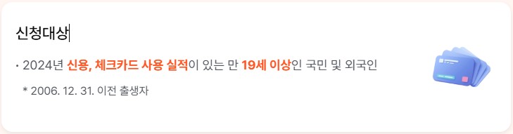 - 네, 만 19세 이상이고 2024년 카드 사용 이력이 있으면 대한민국 국민 및 외국인도 신청 가능